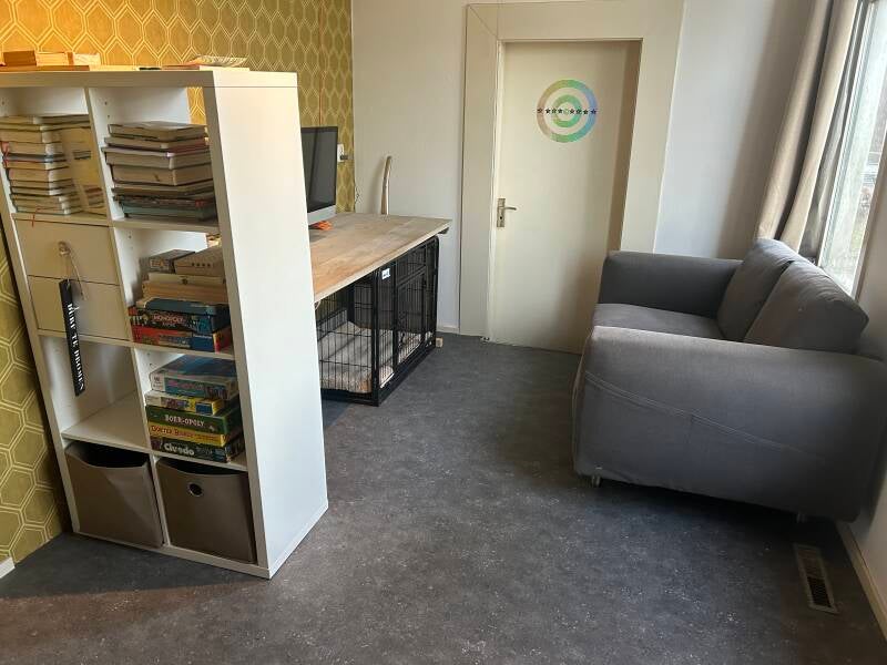 Tijdens het opruimen in huis kom ik ontbijtkoek tegen. Het gekke is dat ik bij ontbijtkoek altijd moet denken aan een hondendrol... Wisten jullie namelijk dat je van ontbijtkoek een perfecte hondendrol kunt namaken? Ik kreeg toen ik 16 was mijn eerste hond: Sam. Dit ging gepaard met de grote grap van mijn vader dat ik als sinterklaas surprise hondendrollen kreeg, gemaakt van ontbijtkoek. Het kwaad was geschiet, ontbijtkoek zal nooit meer hetzelfde zijn hahaha. Nu 20 jaar later heeft mijn liefde voor honden een vogelvlucht gemaakt en zijn we druk bezig met de voorbereidingen voor ons vierde nest. Dat deze even op zich laat wachten blijkt helemaal niet zo'n gek idee. Iedereen weet dat vloerbedekking en pups niet samen gaan. Dit lag echter nog wel in de kamer waar de pups overdag verblijven. Aan de klus dus! Zie hier het resultaat met een kleine hint naar ons volgende avontuur ;).